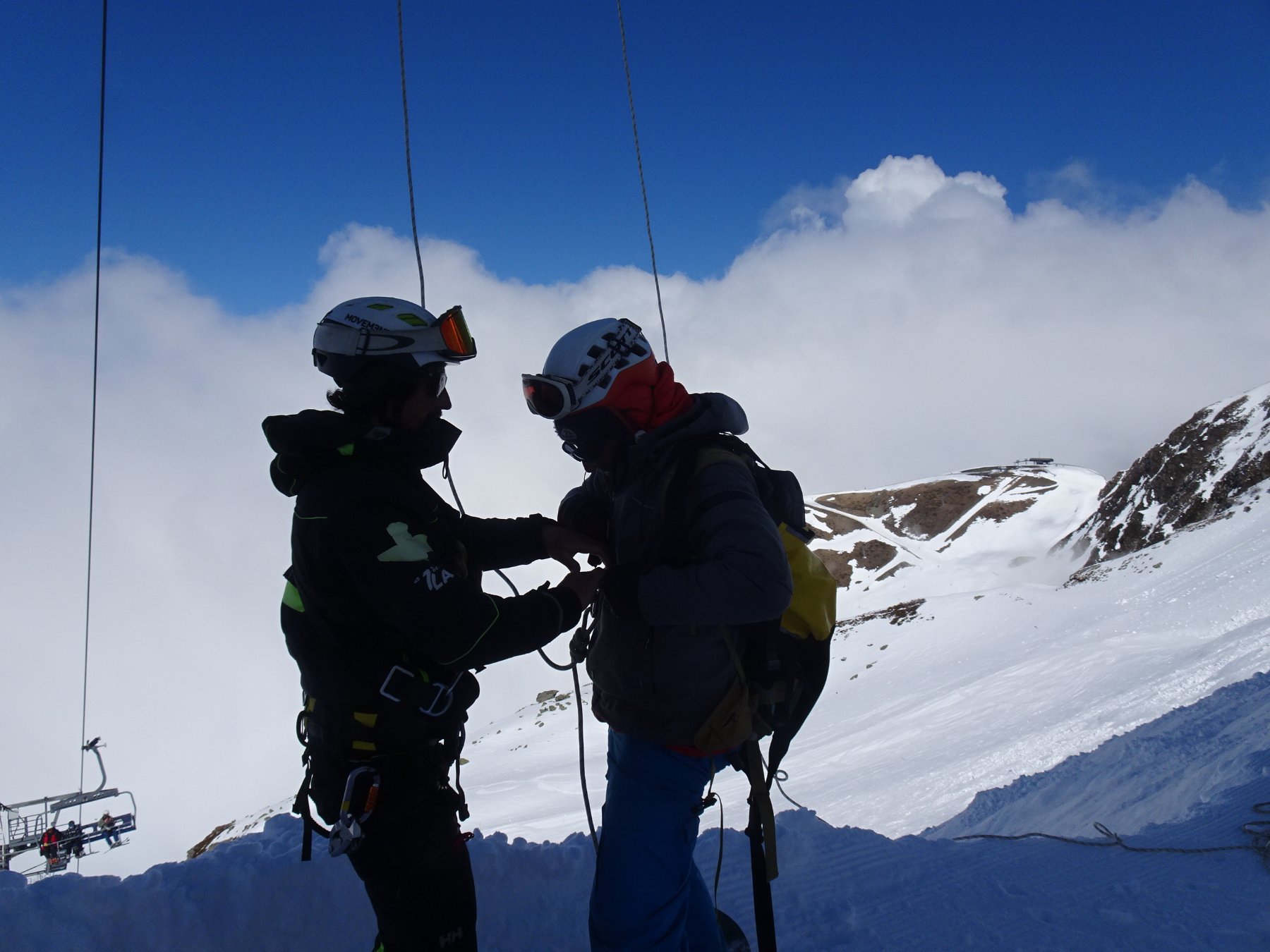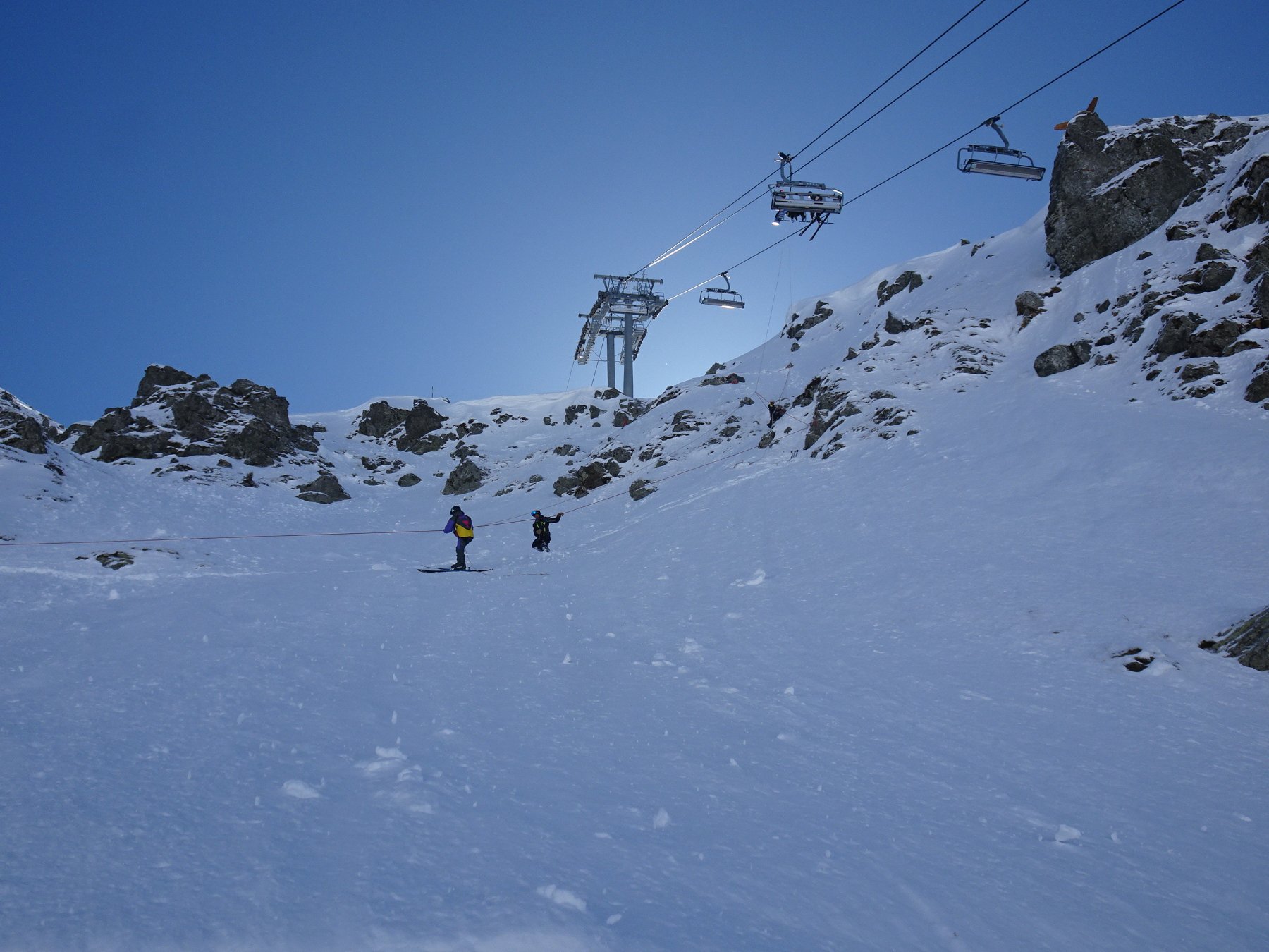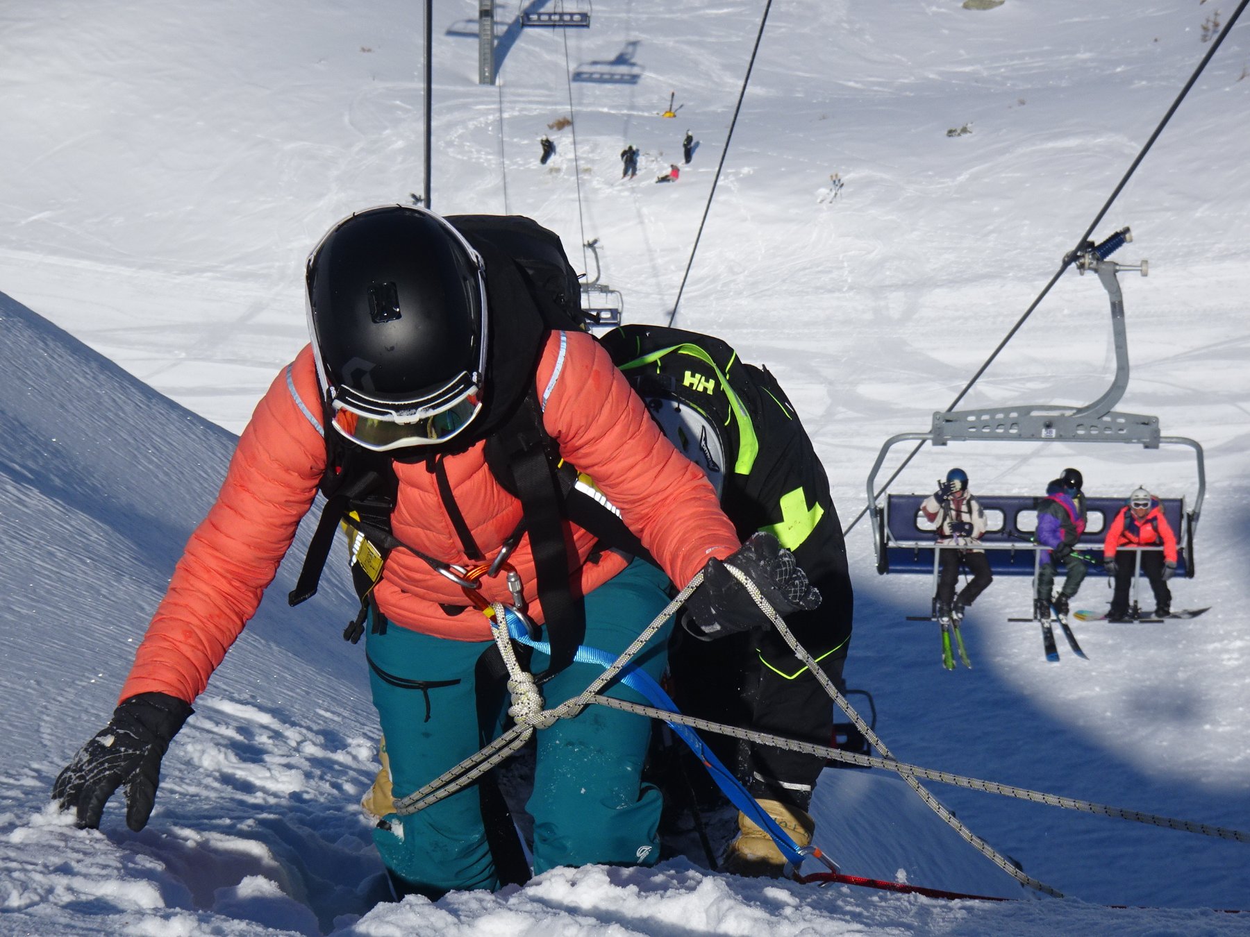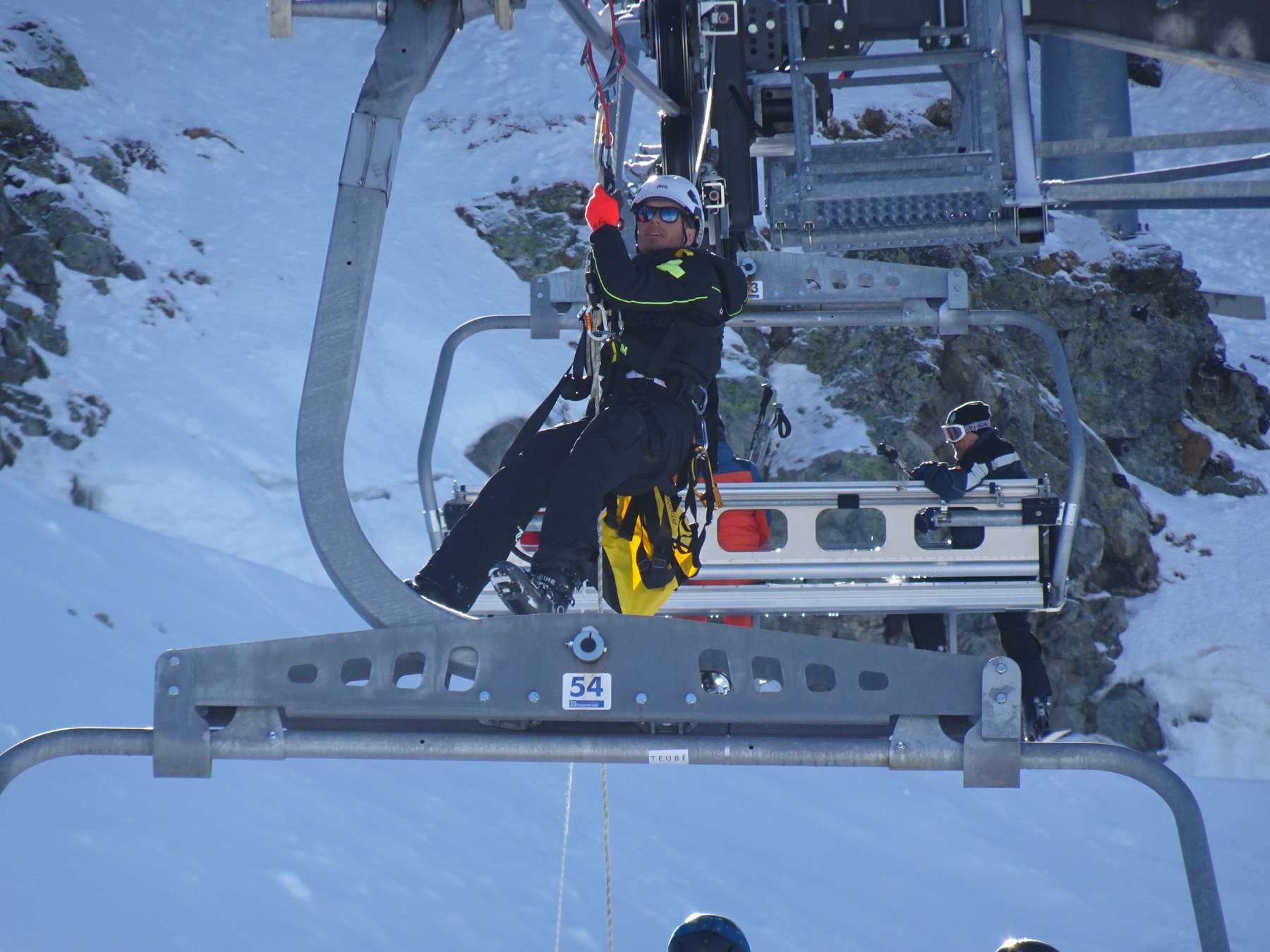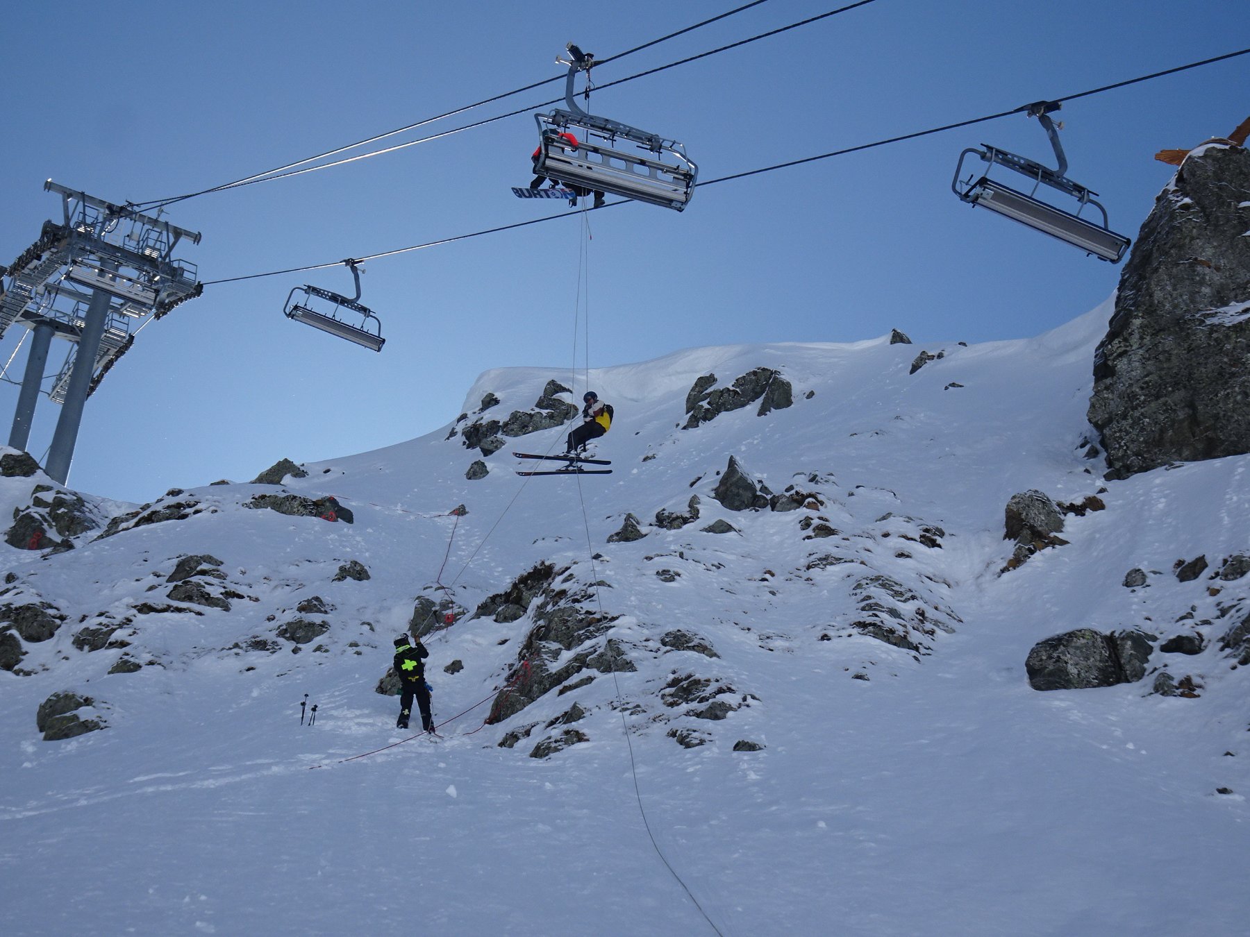 Une fois le siège de devant vidé, le pisteur glisse sur le câble avec une roulette, ambiance tyrolienne