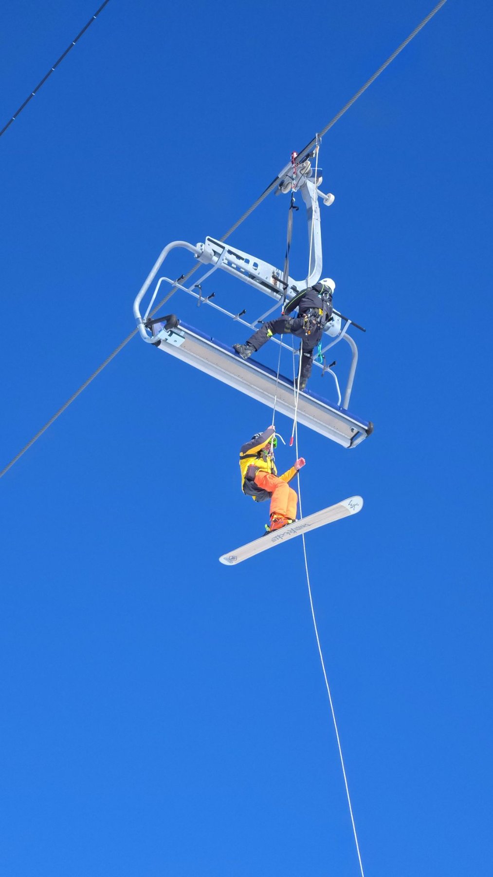 2 pisteurs s'arrêtent au pylône 1 siège devant nous et 1 grimpe au sommet