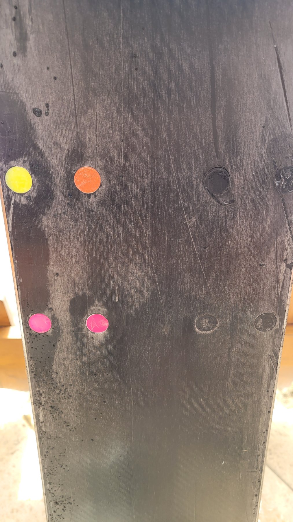 Déjà les inserts multicolores il en avait peut être pas d'autres, ça fait un style et ça gêne en rien. Par contre un coup de ponceuse aussi grossier par dessus sans même en profiter pour boucher au moins les rayures qui sont sur la même zone alors qu'il y en avait pour 2 minutes...