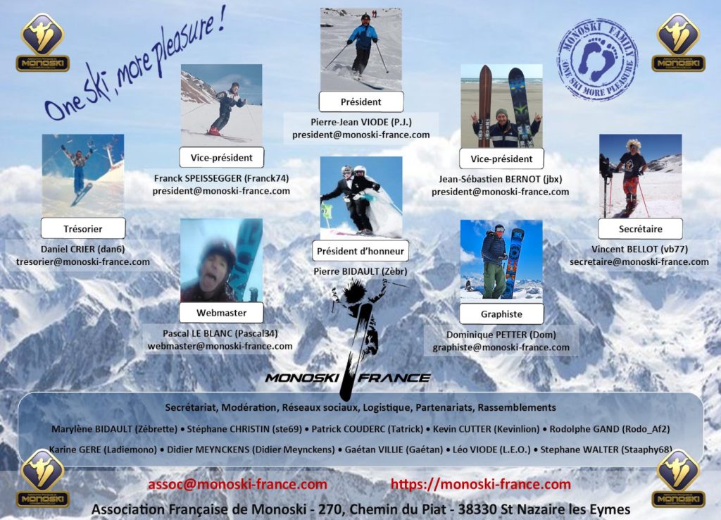 L’Association française de monoski est une association “loi 1901 ”, déclarée à la sous-préfecture de Bonneville (74), inscrite au Journal officiel sous le n°W432001155. Les statuts modifiés le 10 novembre 2019 sont disponibles ici-même (PDF).